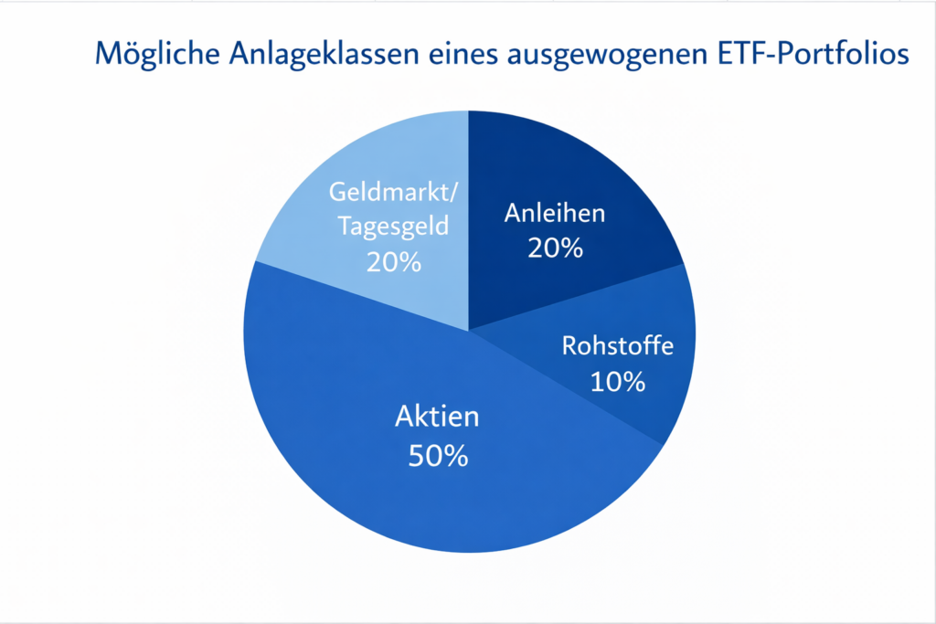 Aktien und Anleihen stellen die Basis für ein ausgeglichenes Wertpapierdepot dar. Aufgrund des niedrigen Zusammenhangs («geringe Korrelation») bzw. sogar entgegengesetzten Zusammenhangs («negative Korrelation») der Renditen tragen diese beiden Anlageklassen am meisten zur Gesamtdiversifikation eines Portfolios bei. Trotz möglicher Negativrenditen von Rentenpapieren (z.B. Staatsanleihen) eignen sich Anleihen aufgrund ihrer risikomindernden Wirkung als Puffer und Sicherheitsanker fürs Depot. Als Beimischung eignen sich aus den gleichen Gesichtspunkten Rohstoffe (max. 20% des Gesamtdepots). Sie sollten bei allen Anlageklassen auf eine Streuung über Ländergrenzen hinweg achten, um das Risiko Ihres Portfolios noch weiter zu senken.